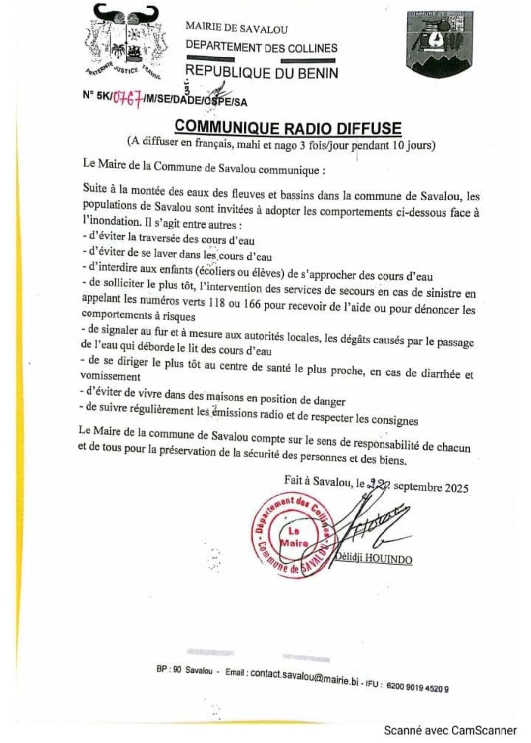 Face à la montée des eaux des fleuves et bassins, le maire de Savalou Dèlidji Houindo invite les populations à la vigilance. C'est à travers un communiqué en date du 22 septembre 2025.