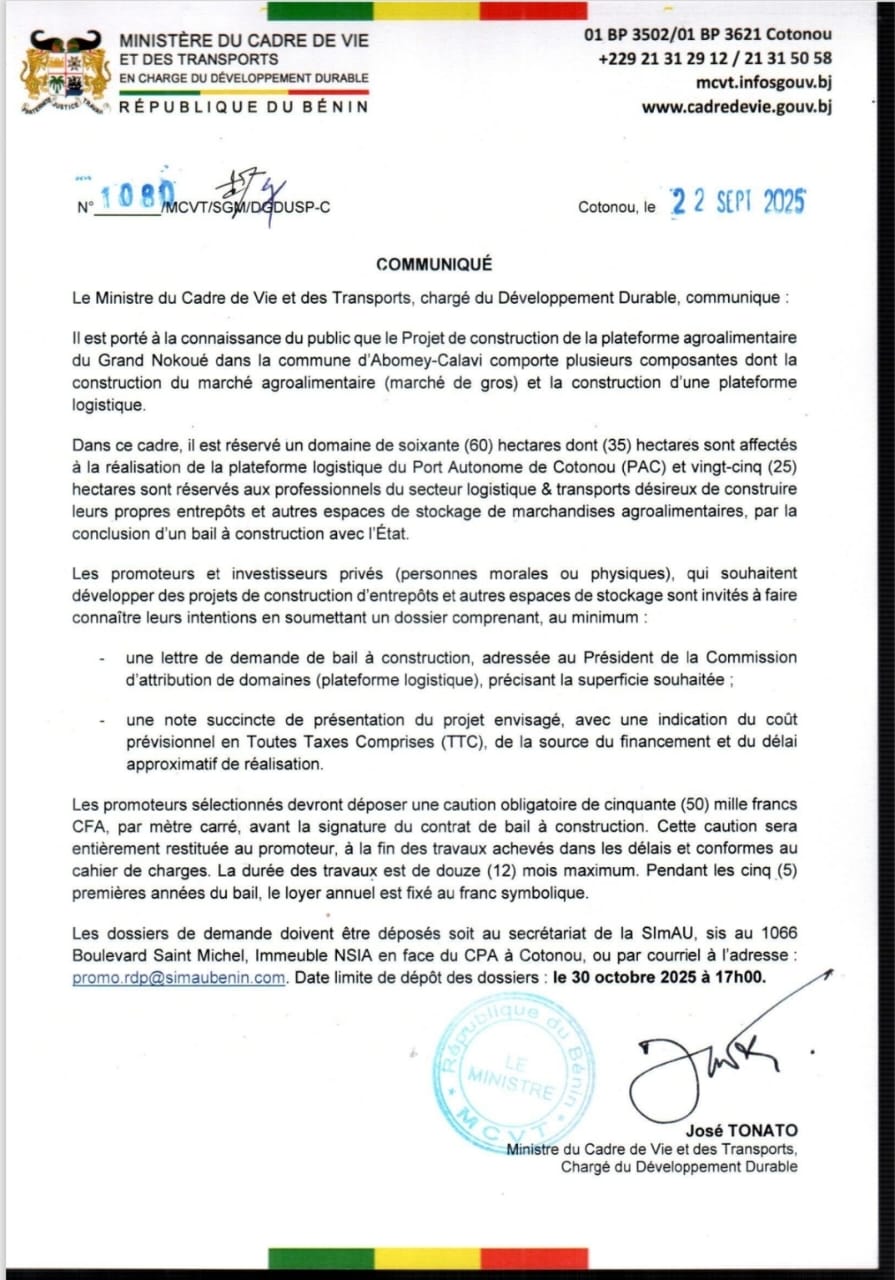 A travers un communiqué en date du 22 septembre 2025, le ministre du Cadre de Vie et des Transports, chargé du Développement durable lance un appel à projets pour la construction d'entrepôts et autres espaces de stockage sur la future plateforme agroalimentaire du Grand Nokoué dans la commune d'Abomey-Calavi.
